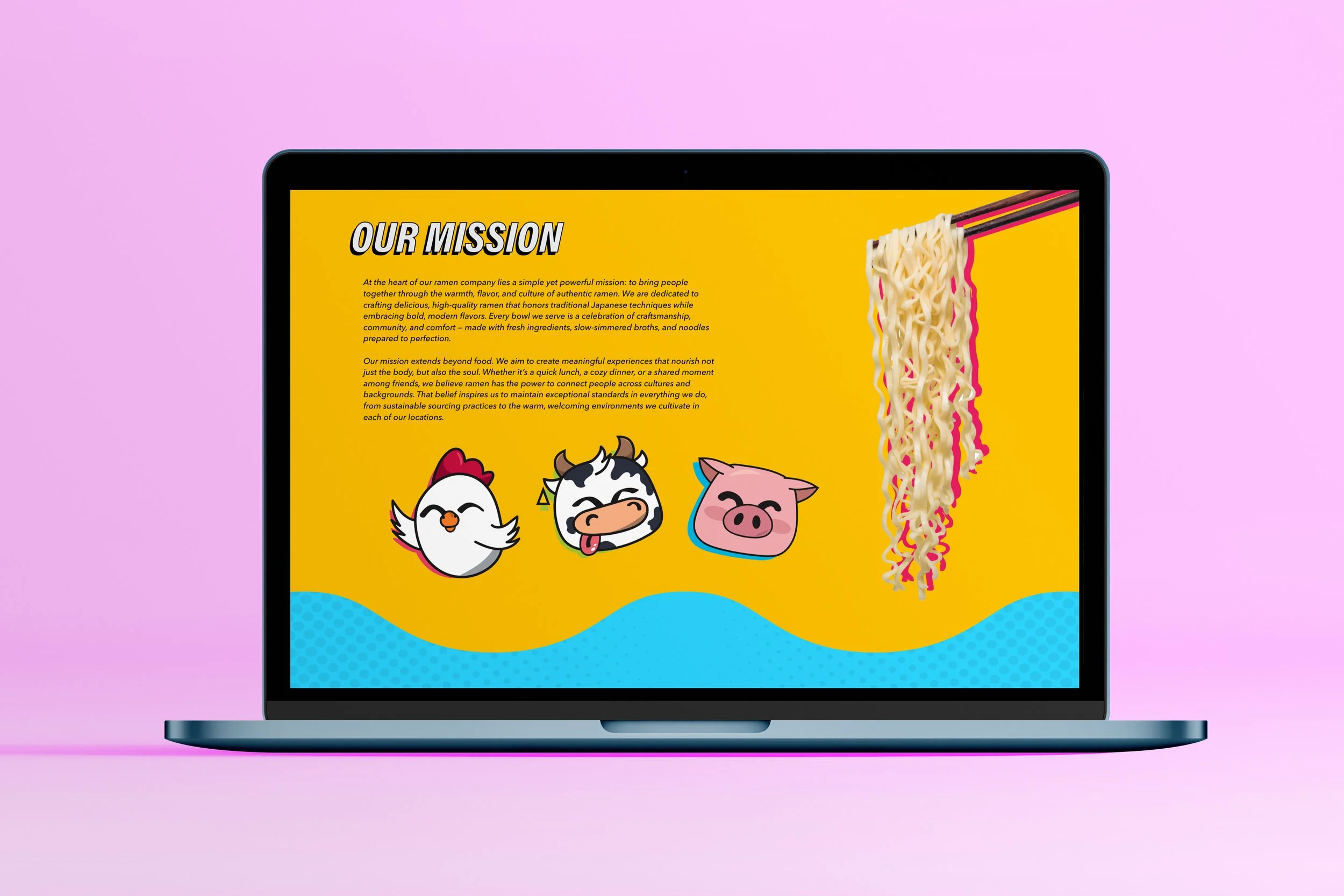 As I began to develop the website and packaging, I went back and fixed up the menu, giving it more readability and structure, then blending in the style and brand elements. The website was designed efficiently while loosely following trends from other ramen websites.