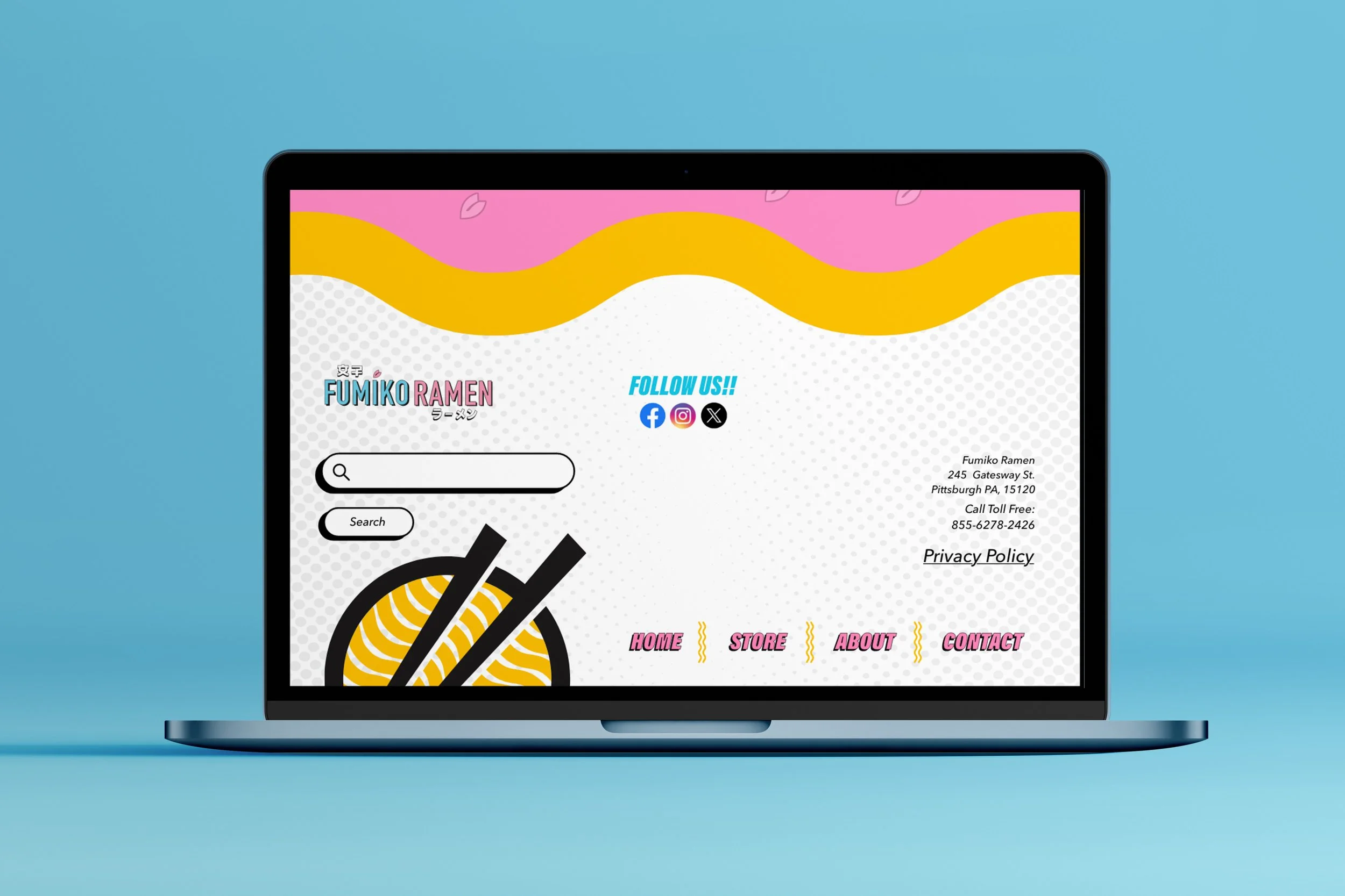 Combining western style and culture with a bit of Japanese culture and innovation. Reminiscent of synth-wave, this is where the modern Japanese animated pop culture came from. Using that and looking at Japanese modern design and media for the branding elements, language, typography, and illustration. I also looked at ramen manufactures’s websites like Maruchan for website style and layout.