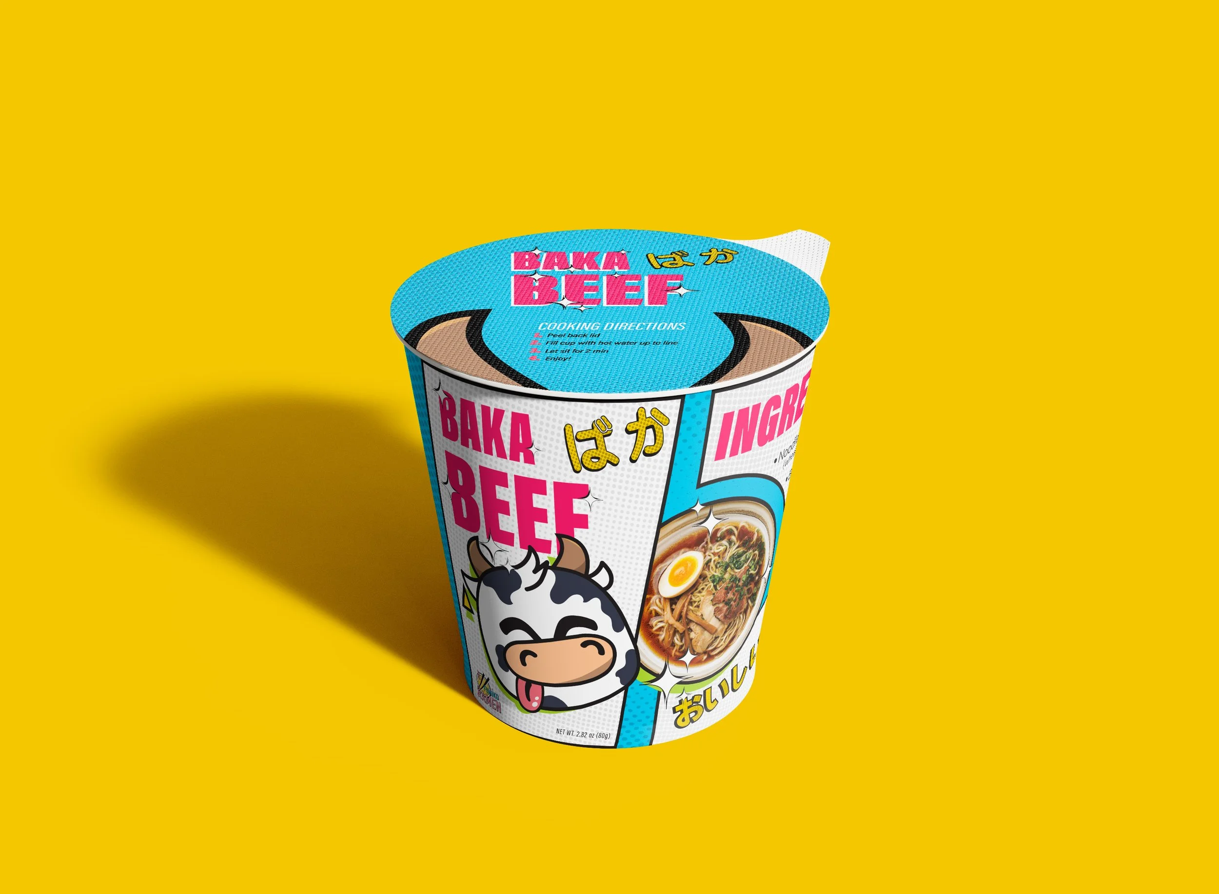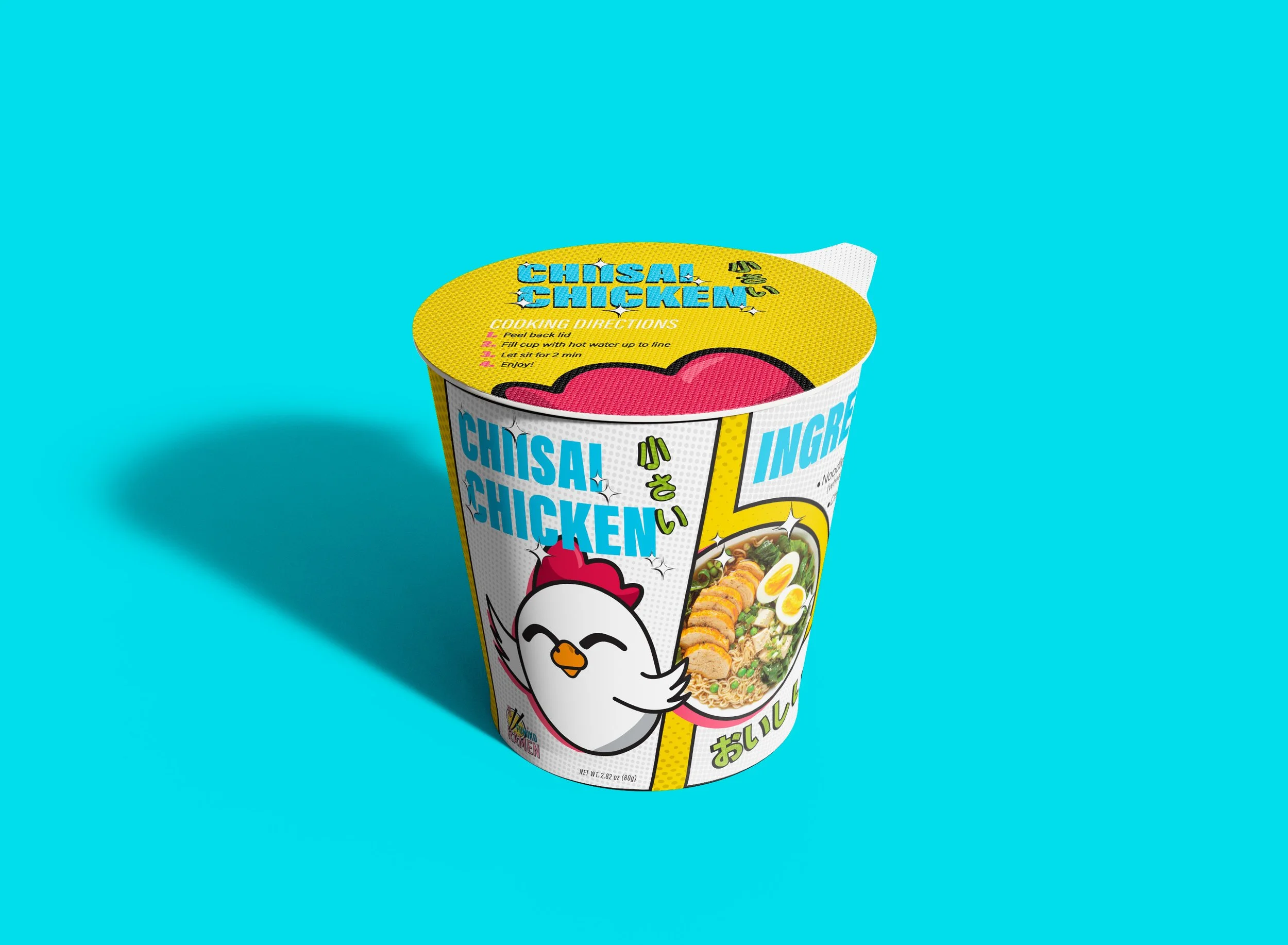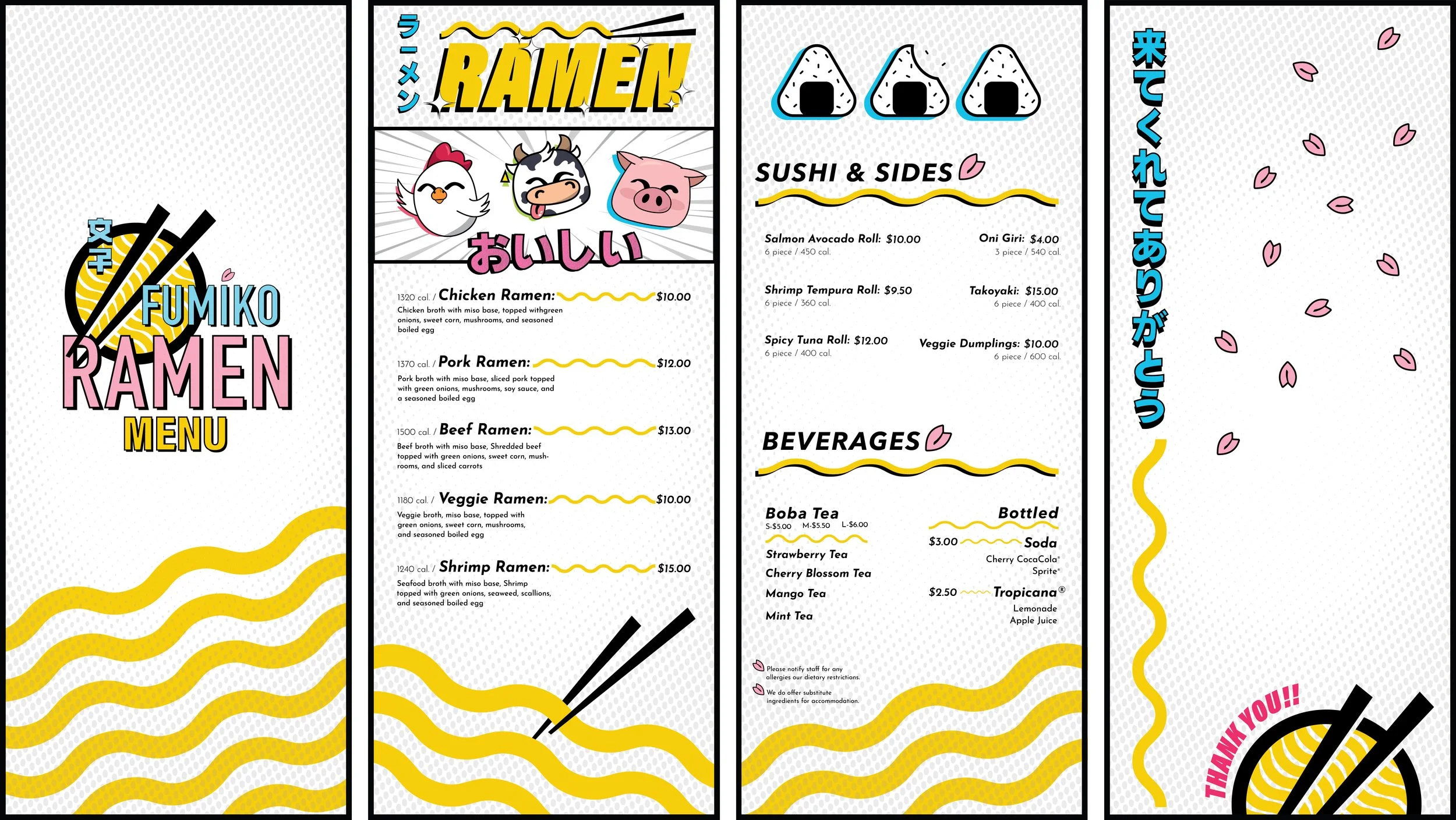I started experimenting using halftone patterns, using them in the background of the deliverables. Heavily relying on bold strokes and text in the menus and the instant ramen cups. For the ramen cups, I illustrated three characters plus one that I had to scratch. These were the Cow, Pig, and Chicken for the different flavors of the ramen. The menu held me back a bit. While finishing the instant ramen cups, I was following the bold pop style too closely for the menu, and it was not improving.