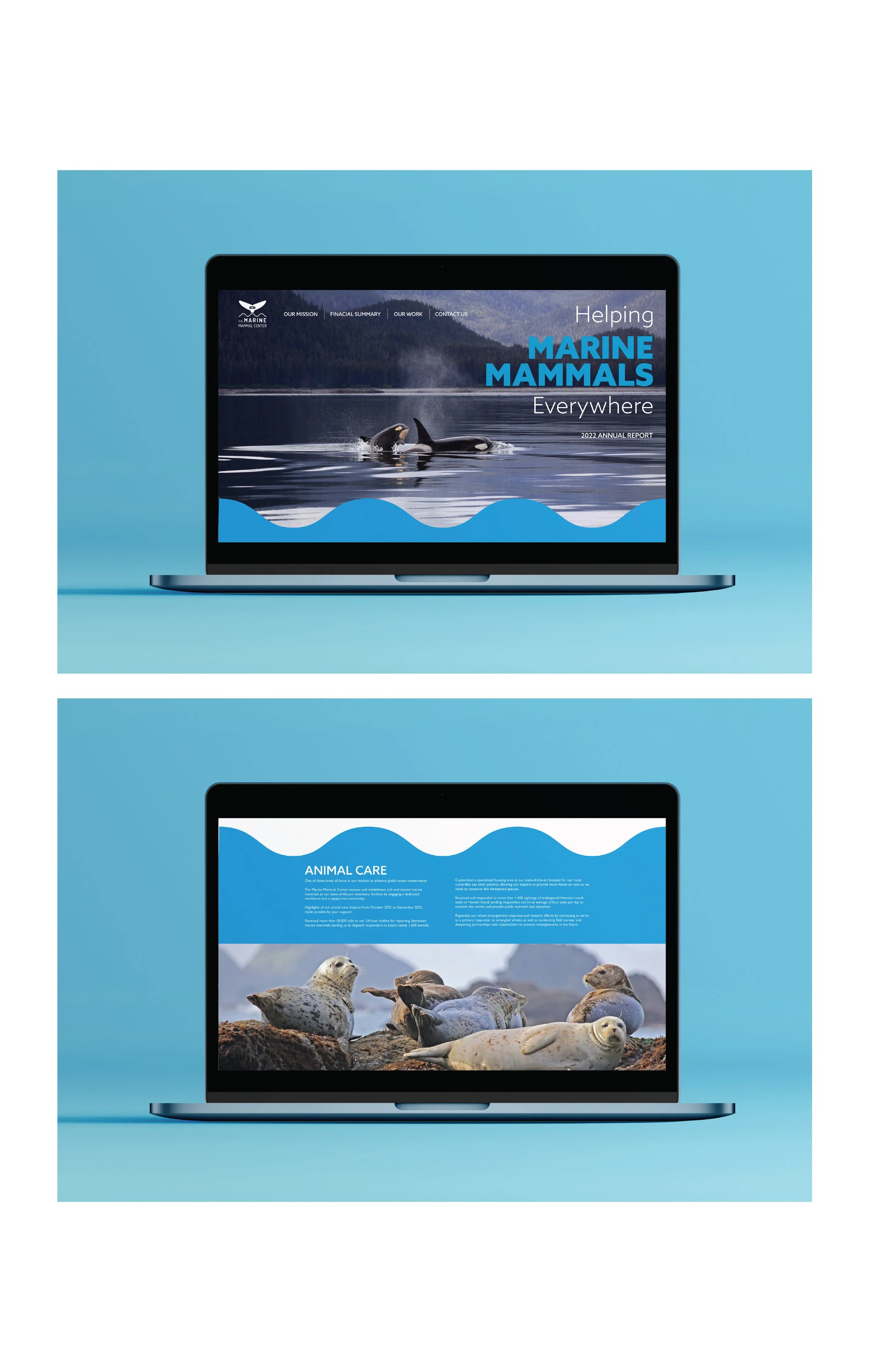This project is a single-scroll prototype website for the Marine Mammal Center’s 2022 Annual Report. I used the provided stock imagery and a blue wave theme throughout the site. This was a good exercise for organizing a lot of data and information and making them look designed and comprehensible.