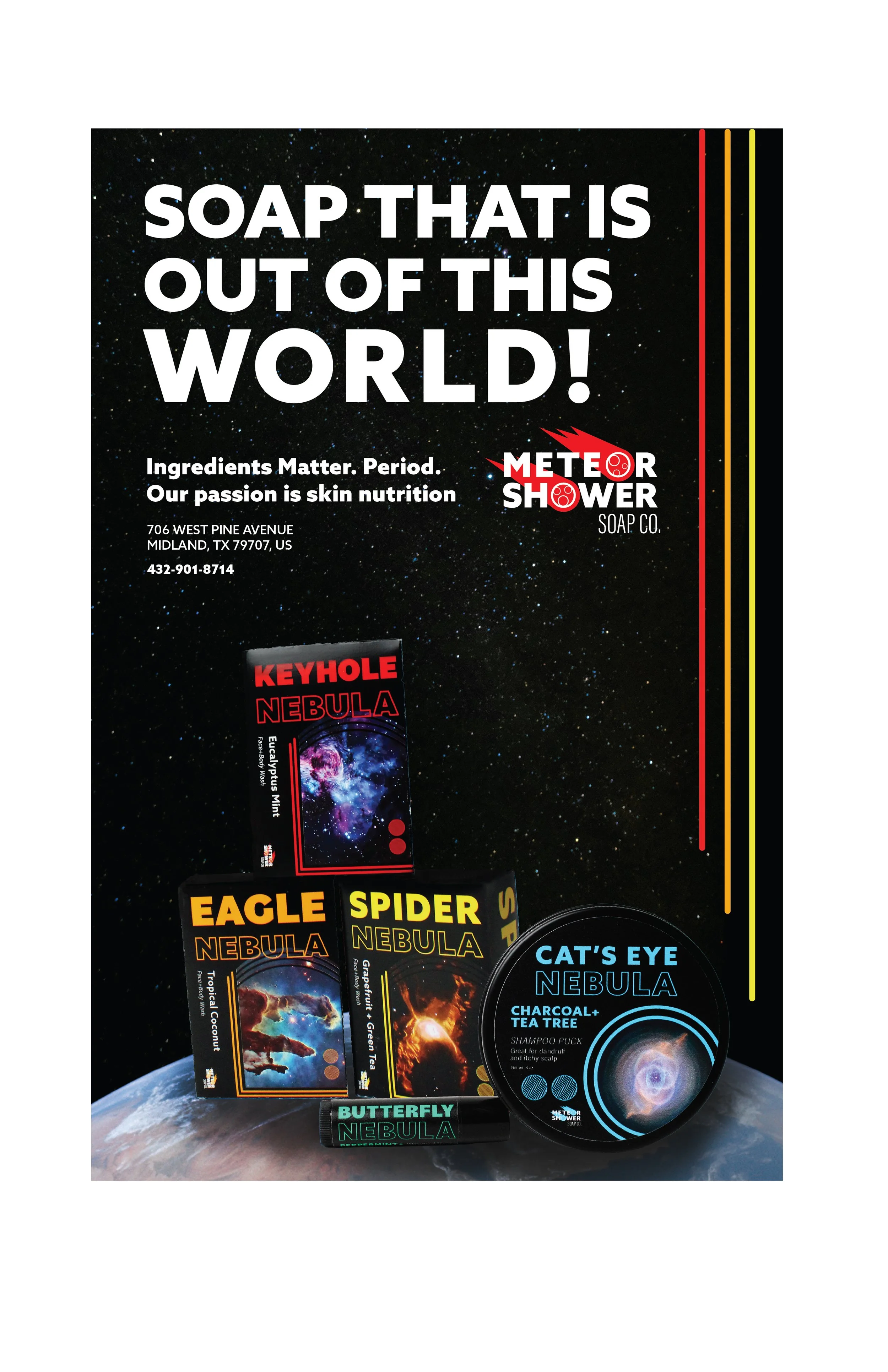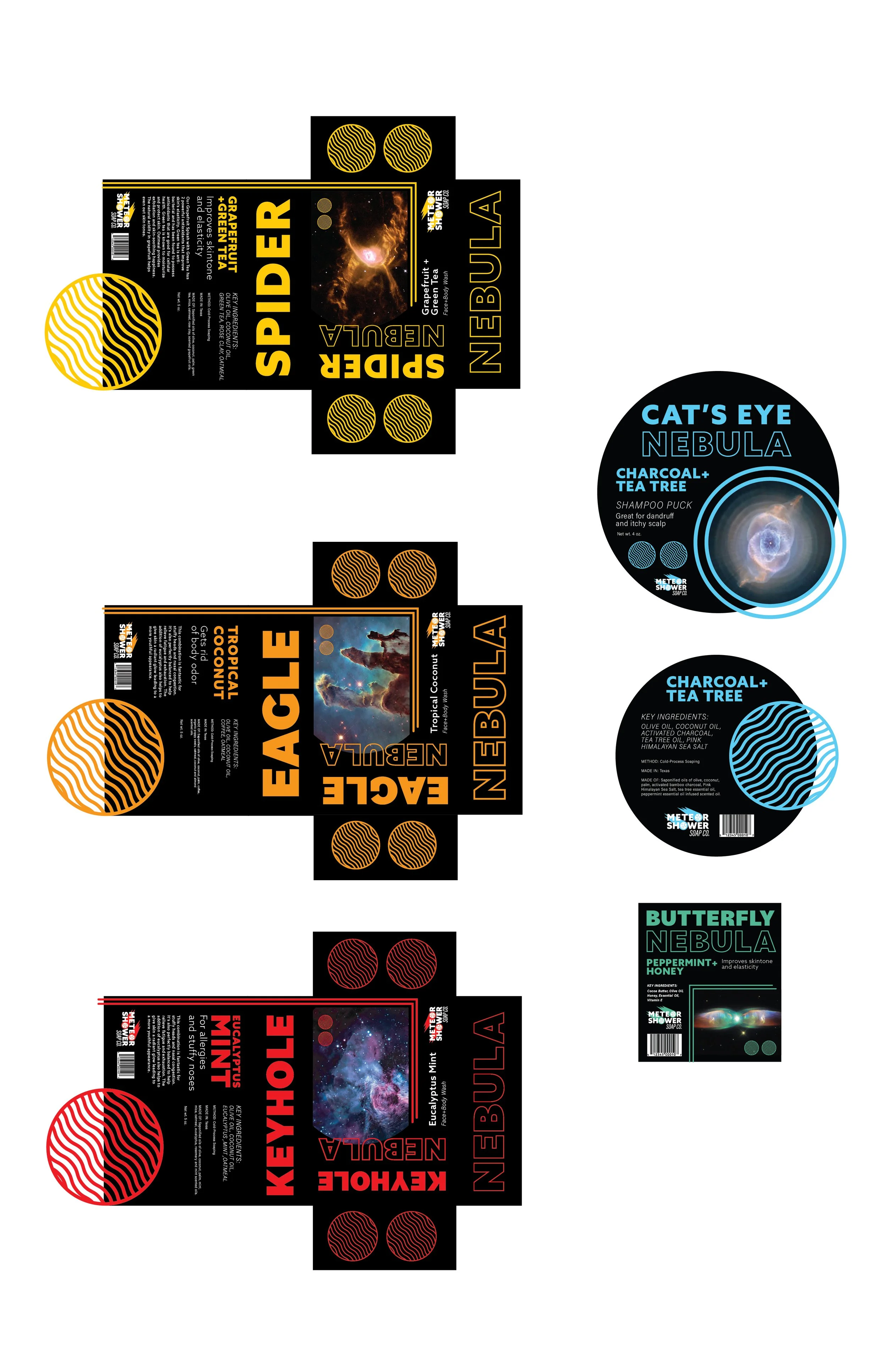 This is a branding and packaging project that is a space-themed soap company. The theme was inspired by the name for meteor “SHOWERS”. I used public domain NASA imagery of different nebulas for the different scents. The graphics are for a pop of color and to differentiate the different scents when they would be on the shelf in stores. The package below shows the mocked-up soap boxes, an advertisement for the products, and the products as a flat-lay. This project includes three soap bars, a shampoo puck, and chapstick.