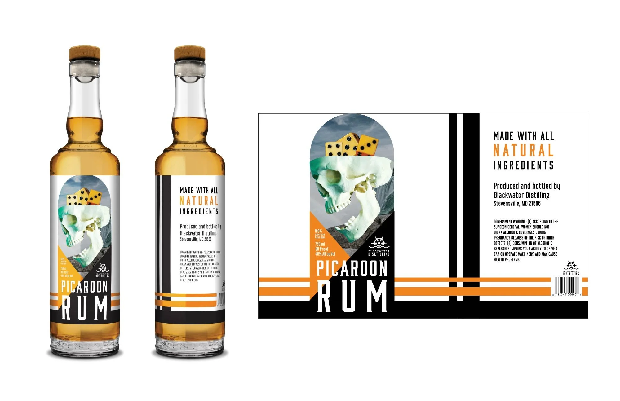 This project was to design a label for a hypothetical distilling company with a pirate theme. The label was designed with a collage style in mind, using bold black and orange elements, matching the rum, dice, and going with the white skull.